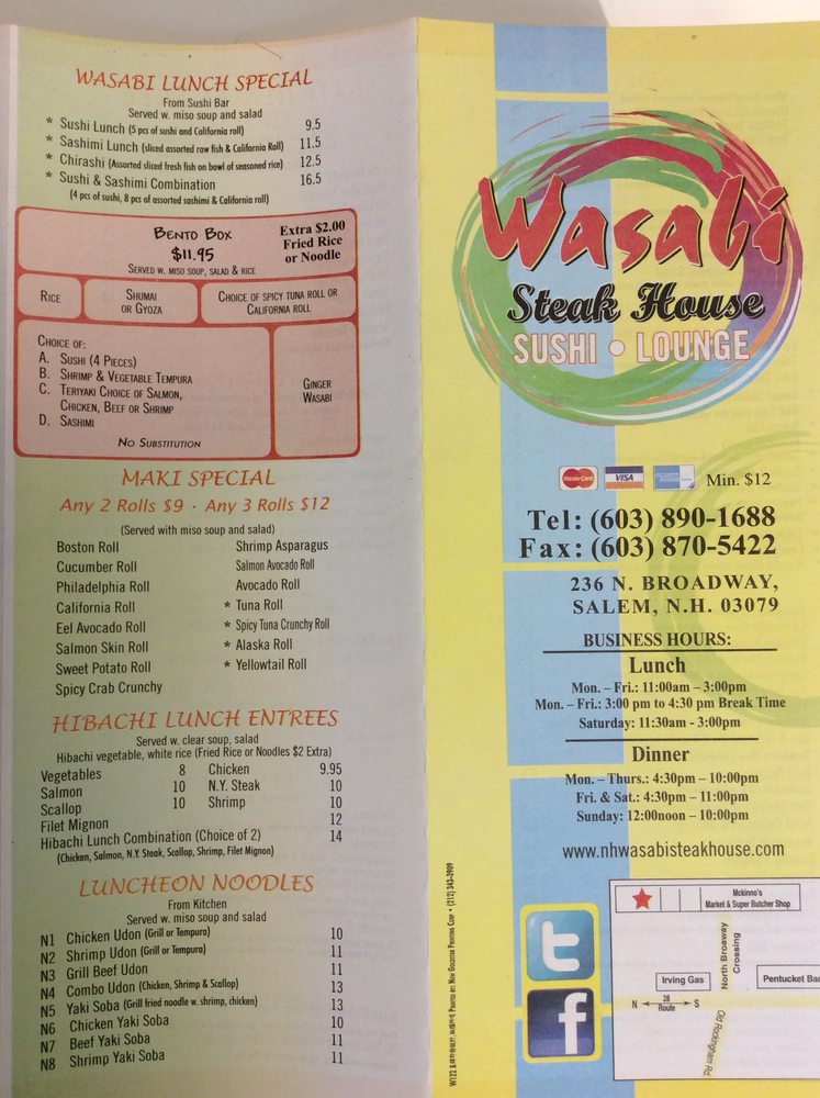 Welcome to Wasabi Steak House, a delightful gem in Salem, NH, where traditional Japanese flavors meet an unforgettable dining experience. This casual eatery offers a vast menu featuring teriyaki, hibachi specialties, and enticing sushi options. Each meal is prepared right before your eyes, with chefs showcasing their skills on a hot grill, creating an atmosphere that is as entertaining as it is delicious.